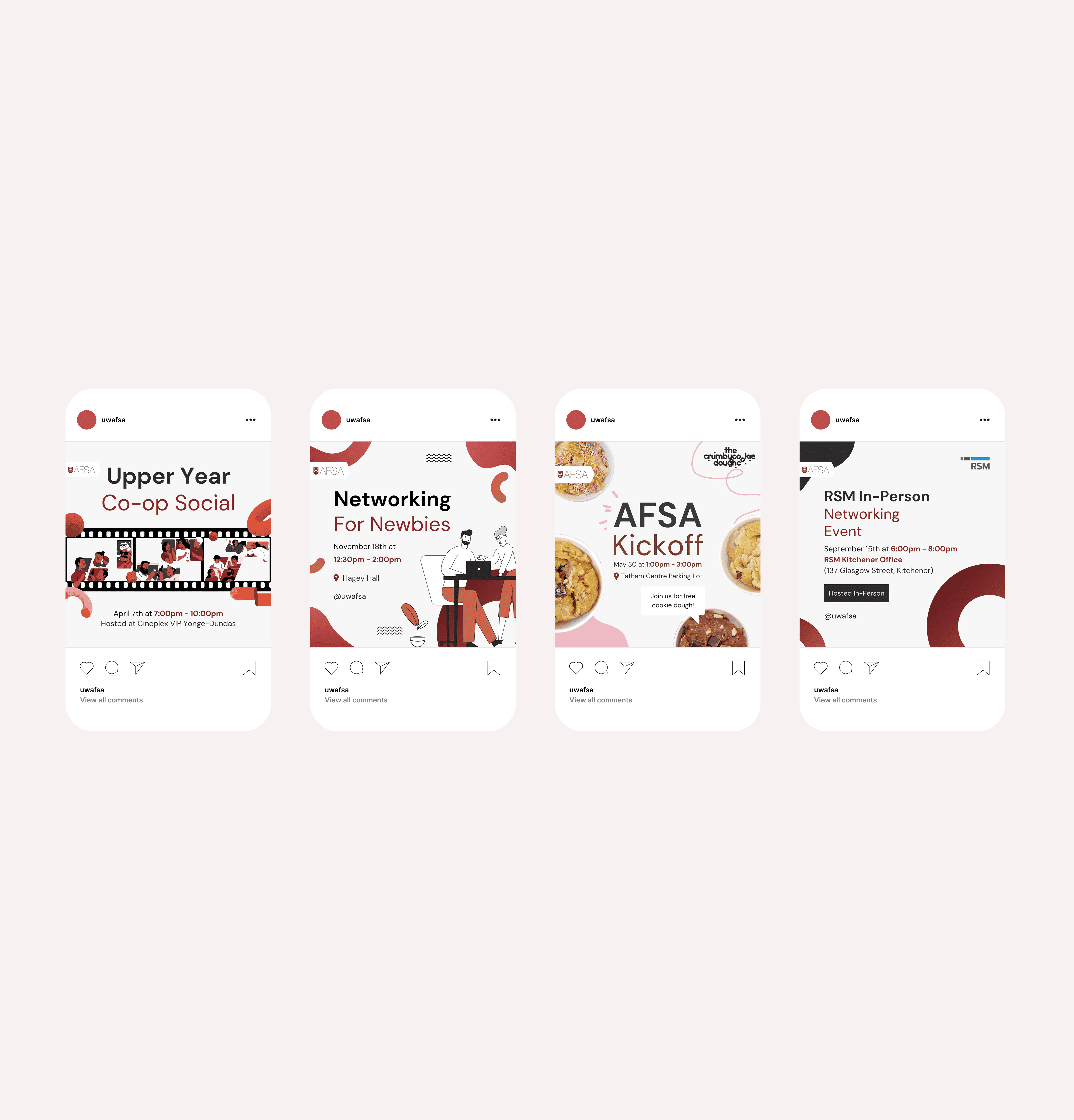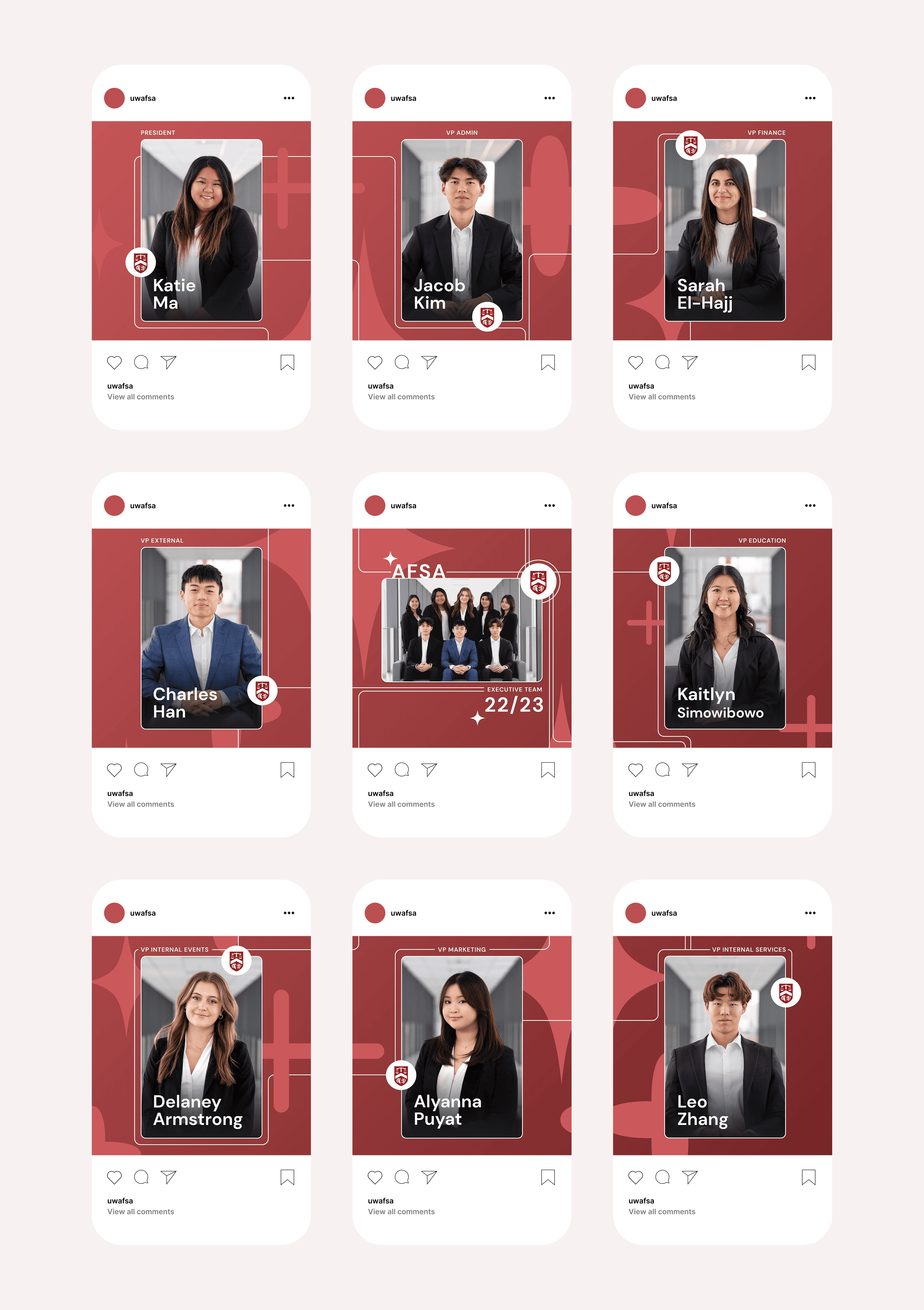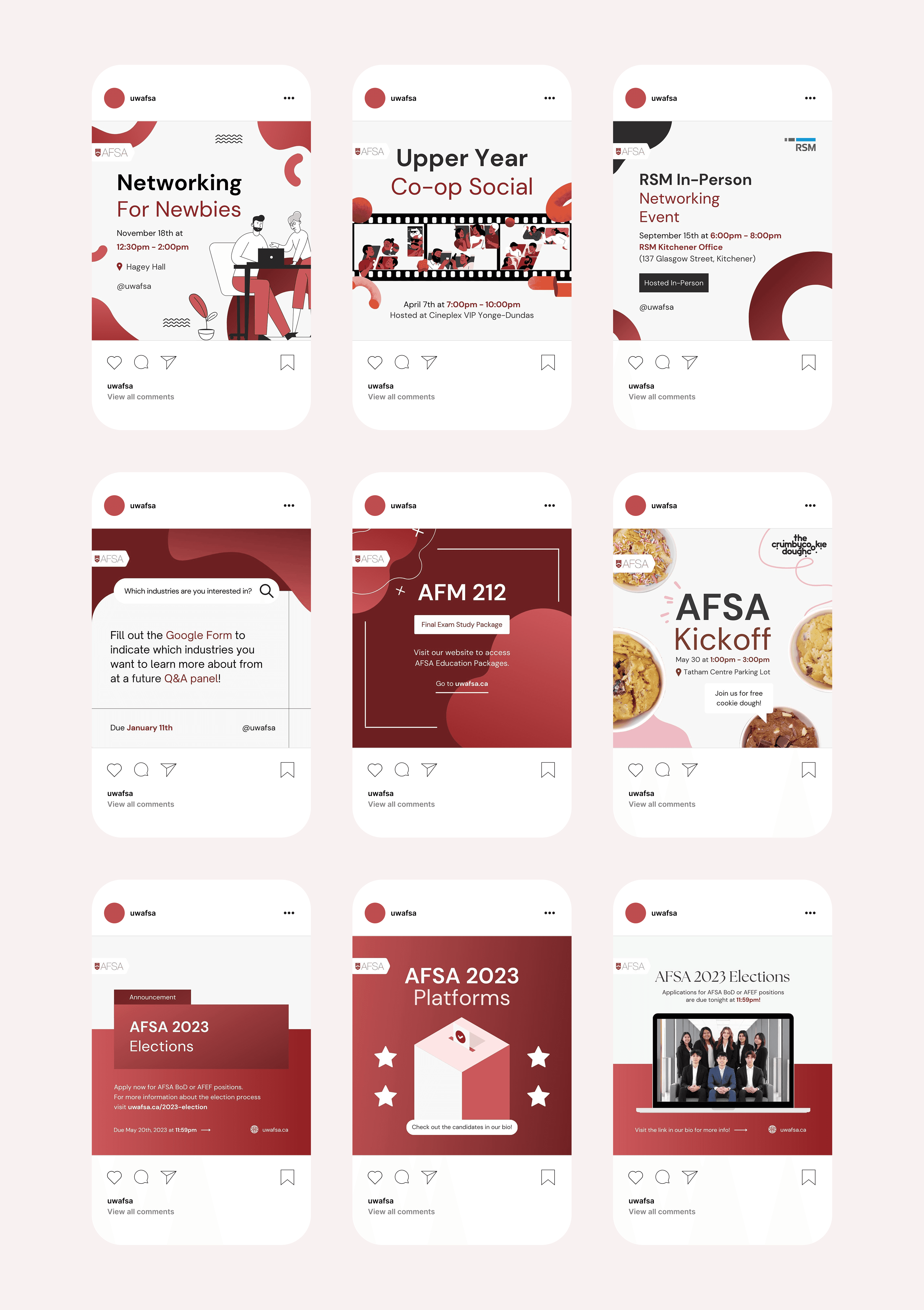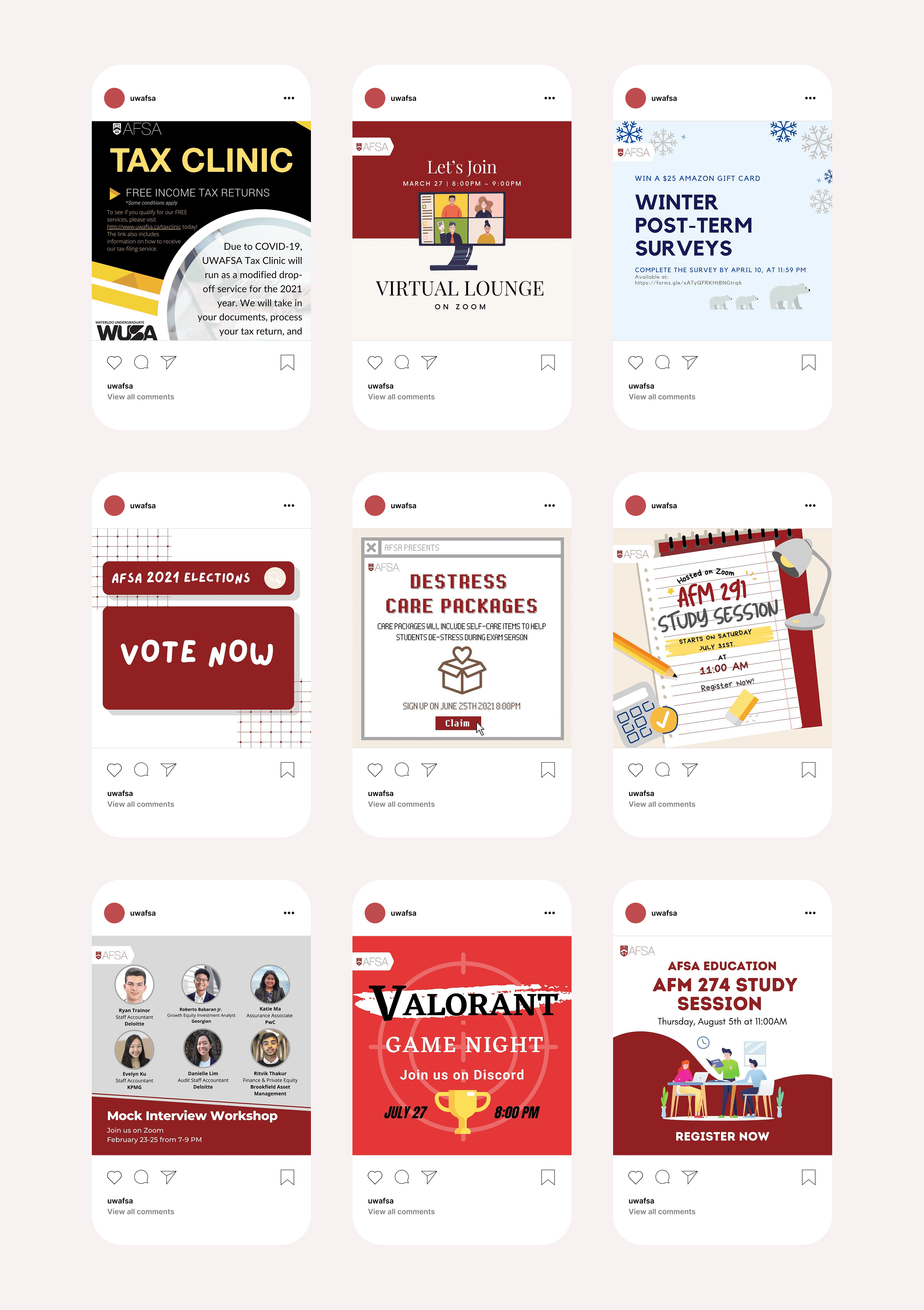 I joined AFSA in my first year as a Graphic Designer in the marketing department. At the time, AFSA lacked cohesive branding that would make its posts stand out from other educational clubs within SAF. Below is a glimpse of the AFSA Instagram feed when I joined.