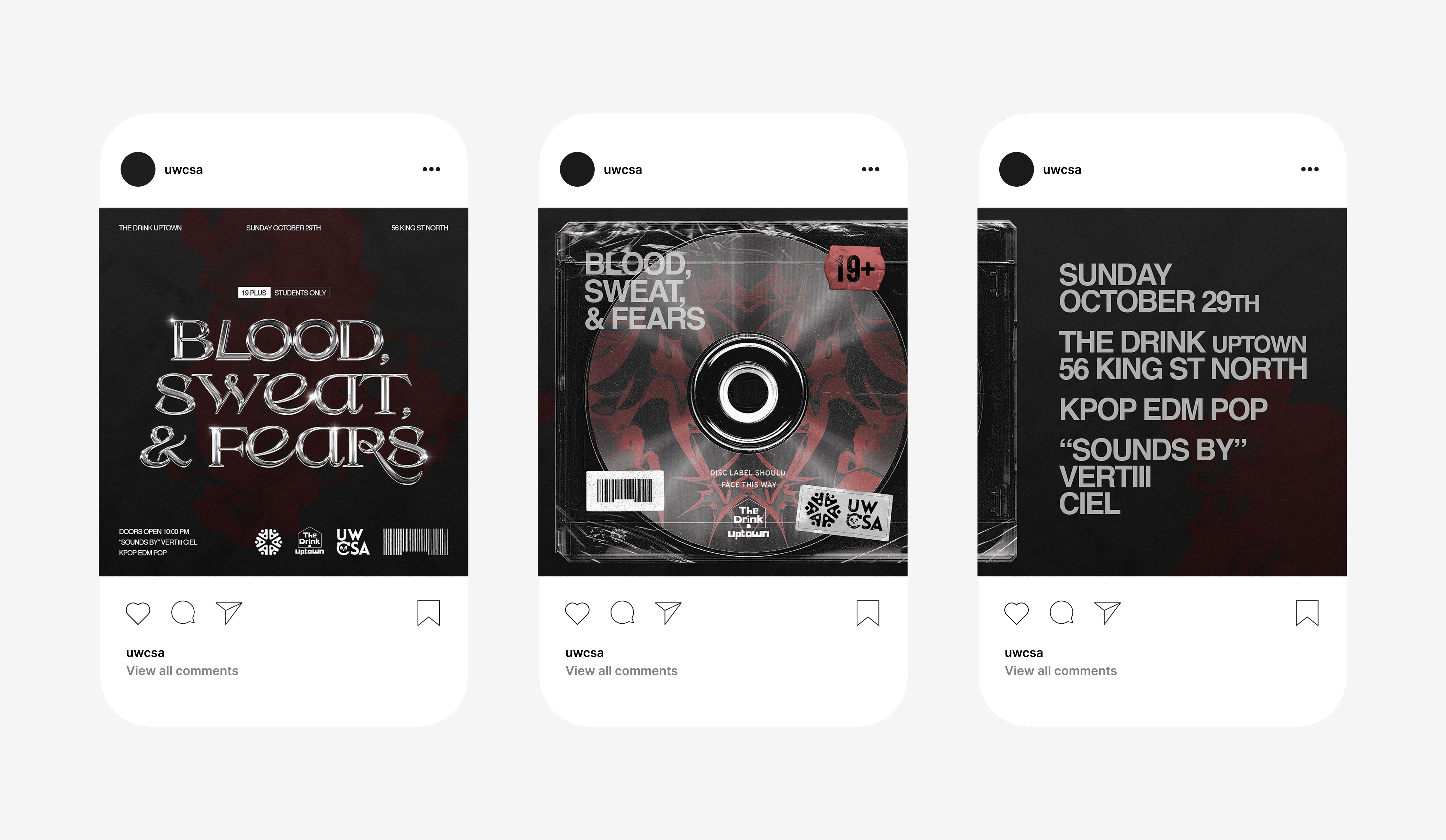 Blood, Sweat & Fears was a Halloween event hosted by UWCSA. I was tasked with designing something grungy and eerie to capture the Halloween spirit and showcase the DJ's playing.