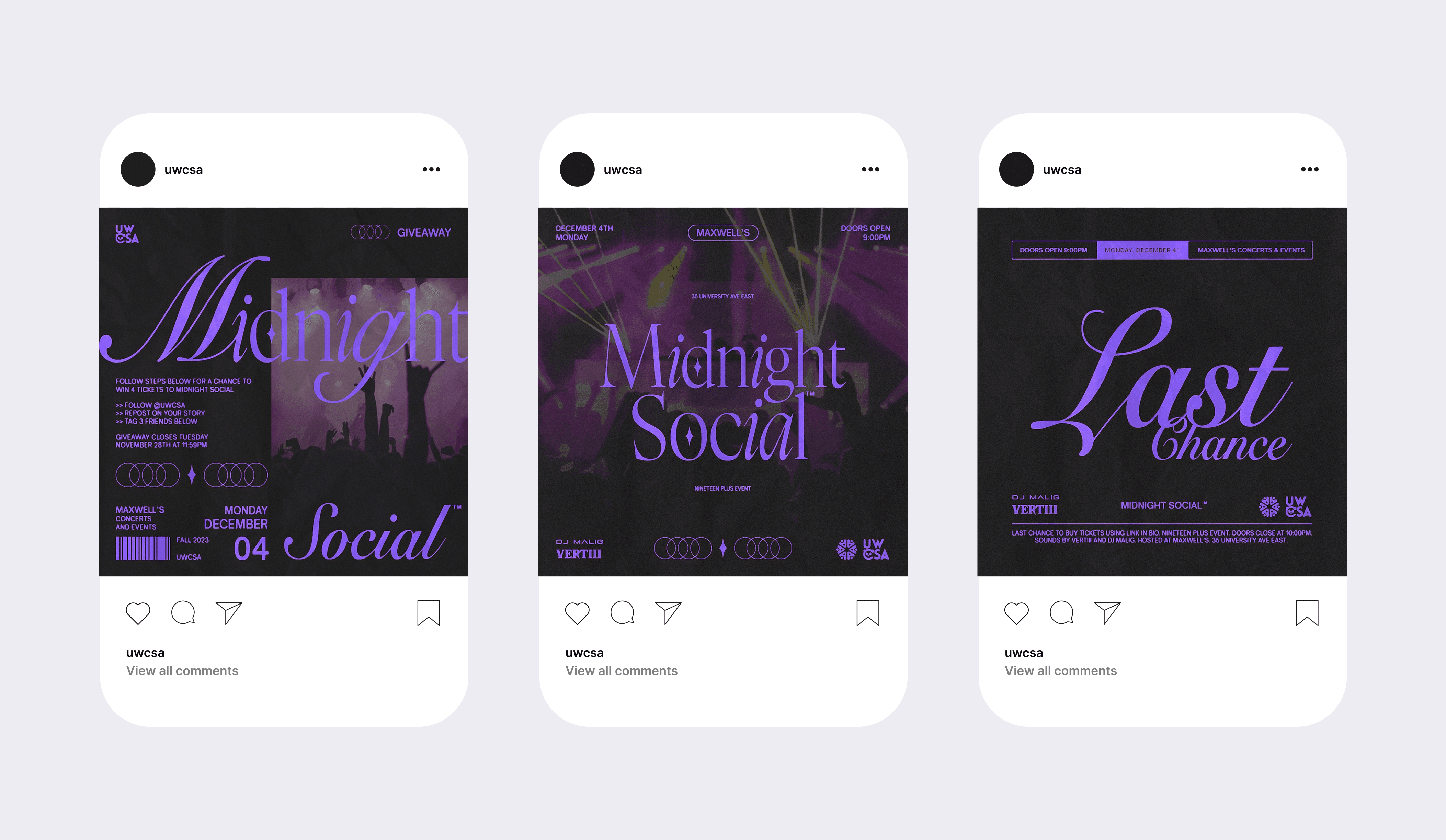 Midnight Social is the largest social event at Waterloo, drawing over 1,000 attendees annually. My goal was to create a dark and visually striking design that captured the event’s late-night vibe.
